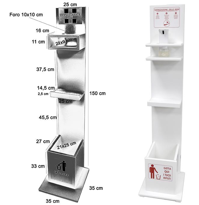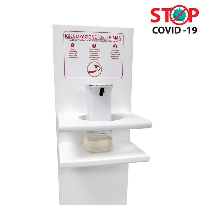 Realizzata in MDF con base da 40mm e struttura da 25mm, è indicata da posizionare in centri commerciali, negozi e reception di uffici per consentire la disinfezione delle mani.